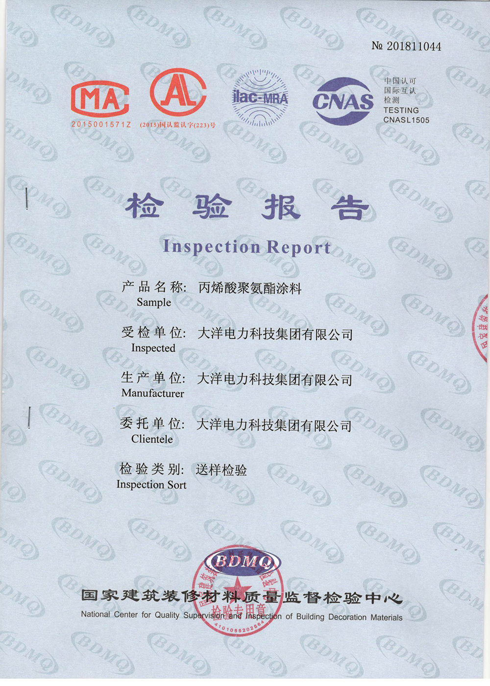 丙烯酸聚氨酯涂料檢驗報告